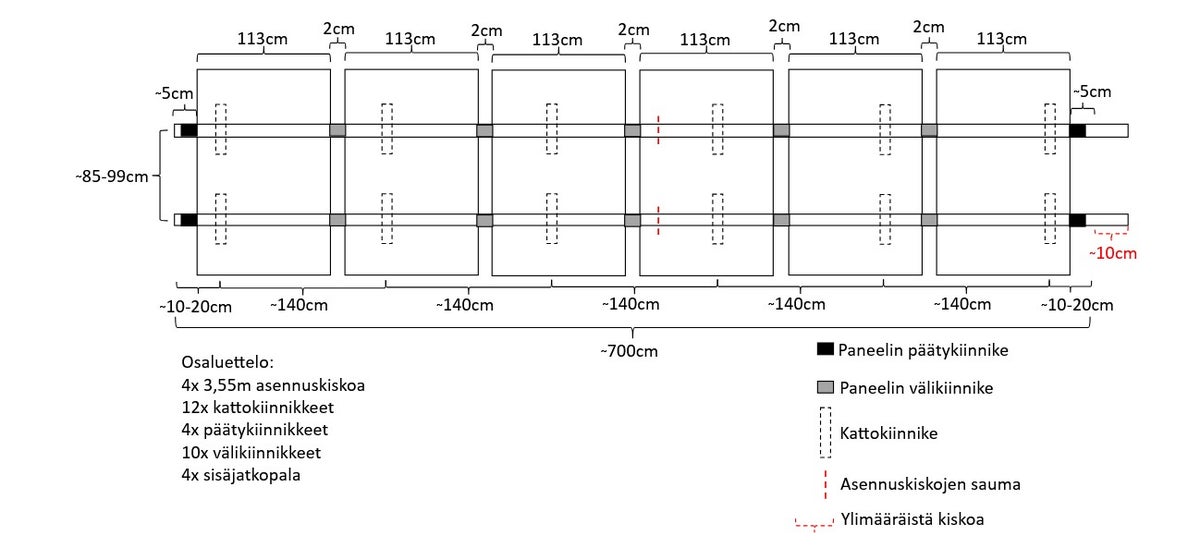Ota yhteyttä asiakaspalveluumme halutessasi tarkempaa suunnittelua tai räätälöintiä. Järjestelmään on esimerkiksi helppo lisätä kaksi paneelia vielä lisäksi, jolloin paneelit asennettaisiin kahteen ryhmään 4+4 kpl.